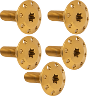 Bolt Kit - Holeshot Front Floating Brake Rotor - Spoke Mount - Gold - 5 Pack. Revolutionary design merges the floater bolt & bushing into one powerful unit for a sleek appearance and enhanced durability, Boasts a lightning bolt-inspired CNC drilled design, Crafted from precision-cut titanium, Kit includes: Five floating bolts, Five spring washers, Replaces OEM bolt part # 41500020 and OEM bushing part # 41500018., Matching 5/16" & 3/8" hub mounting bolts sold separately.