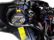 This 6 Speaker / Dual Amp Complete System is perfect for those who love to take risks and push the limits! With a 200 W amplifier to power the front and rear speakers, and a 225 W amplifier for the 7" woofers, this kit will provide a challenge and adventure for your ears. It includes XL Series front and rear speakers and a 7" woofer kit specially designed for the (vented) fairing lower glove boxes. The installation is a breeze with all Plug-n-Play wiring and hardware included. And the best part? Both amps fit inside the fairing and require no additional upgrades to your factory charging system. Get ready for a wild ride with this bold and powerful sound system!