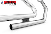 Freedom standard true-dual header has an individual header for each cylinder. The front cylinder pushes more than the rear because it gets more air & gas, generating more horsepower. The “Crossover Chamber Header” combines front & rear header cylinders co-mingling, adding heat in the crossover chamber to generate more torque.
