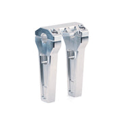 These geometrically shaped risers not only look like a stealth fighter but they offer the same aggressive agility and styling. This set up gets away from the traditional round 1-inch, 1.25-inch, or 1.5-inch riser posts we are used too. These risers have more material giving a larger footprint to the triple tree. With more materiel comes more structural integrity and less cross torsion flex. This product may sound heavy but no worries, these beautiful risers are CNC machined from billet aluminum, so they are very light and very strong. Beefy ARP style 12-point hardware crowns the machined one-piece top clamp. These Performance Risers are offered in 6”,8”, and 10” heights, in 1-inch and 1.25-inch clamp diameters, with pullback and straight options available. Two finishes are offered, Black Anodized or Raw Aluminum to compliment any build your customer has in mind.