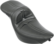 The Maverick Daddy Long Legs Seat in Black with Stitching for FL/FX '00-'17 features a molded one-piece foam foundation wrapped in premium black vinyl atop a 16-gauge powder-coated steel base plate. Designed for taller riders seeking extra room to shift back while keeping passenger comfort intact, its unique contours provide solid support without restricting movement. This comfortable seat maintains a custom look and includes a carpeted bottom to protect your fender. It adds an extra 2" of legroom for the rider. Made in the USA. Note: '05-'17 FLSTC/FLSTN models require mounting bracket #0820-0096, and FLSTN models need luggage rack removal.