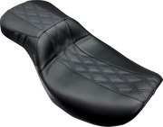 Take on the challenge with the Outcast Daddy Long Legs Seat - 2Up! No backrest, GT2 inlay, FLH/FLT '23-'24. Featuring a strong and daring one-piece foam foundation, wrapped in premium black vinyl atop a powder-coated steel base. Its unique design gives ample support while promoting free and adventurous movements. Built for taller riders seeking more space, this seat is also carpeted underneath to protect the fender. Ready to push boundaries and explore the open road? Made in the U.S.A, this seat also gives drivers an extra 2" of leg room.