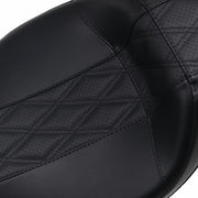 The Outcast Daddy Long Legs Seat features a full-length design without a backrest, finished in black with a striking black double diamond pattern, compatible with Touring models from ’08 to ’22. Built on a sturdy 16-gauge powder-coated steel base, it boasts a molded one-piece foam core wrapped in premium black vinyl. Its unique contours provide firm support while allowing freedom of movement, tailored for taller riders who need extra space to shift back. The carpeted seat bottom protects your fender, and it adds 2" of legroom for a bold, comfortable ride—all proudly made in the USA.