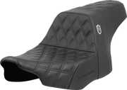 Experience true performance and comfort with the Pro Series SDC Performance Seat! Its contoured lines and bucketed driver's seating area, along with a substantial lumbar, provide the ride you deserve. Only Saddlemen seats with GelCore* Technology have been scientifically proven to reduce engine vibration by up to 50% and road impacts by up to 92%, making it an essential addition for risk-takers like you. Crafted with a carbon fiber front and black gripper lumbar in the passenger area, topped off with a SDC logo badge on either side. Made in the USA. Does NOT fit Trike models.