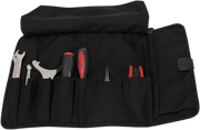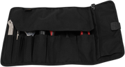 Leather securing straps and carry handle offer support and securing mounting points, Eight-pocket system in three widths to hold multiple tools of various sizes, Catch-all zipper pocket for smaller items, *Anti-Flail Snap System*, High quality *moto centric* speed buckles and zippers, Adjustable quick-release mounting system works on handlebars, sissy bars or side frame mounting