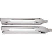 The rear is finished with a rolled scalloped tip, not a simple slash cut, The rolled tip is matched with an inner core finished with the same scalloped cut, Inner tip is actually part of the constant velocity, tuned core that gives the muffler its great sound and performance, Uses a 2.25" perforated core for its traditional and recognizable Harley sound, No unsightly external screws holding in the tip or core giving the muffler a smooth undisturbed finish from front to back