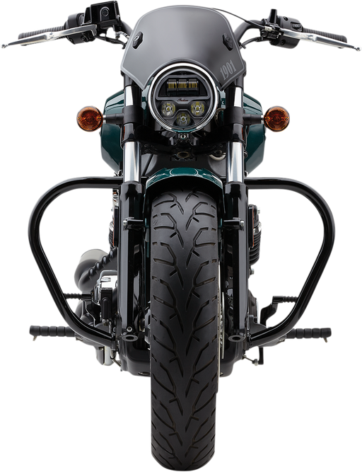 V-Bend Freeway Bar - Black - Softail Presents a v-bend contour that tapers from the top to the narrower bottom for a more aggressive look, Presents...