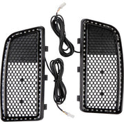 Challenge the darkness with CUSTOM DYNAMICS LED Lower Fairing Light Inserts - Amber! Featuring 53 Amber LEDs per side, experience a blazing amber running light that transforms into a powerful amber turn signal when activated. The unique honey-comb grill design not only looks fierce, but also allows air to flow through. Simply snap the unit in place with easy plug and play wiring for a no-fuss installation. For an added touch, install Optional Lower Fairing Blocker Plates part # 0521-1898 (sold separately) behind the grill for a sleek, solid panel appearance. Replace your dull OEM 57100151 (Left) and 57100152 (Right) lights and light up the night! Also compatible on '14-'22 Street Glide (FLHX), Street Glide Special (FLHXS), Road Glide (FLTRX) & Road Glide Special (FLTRXS) with aftermarket Harley-Davidson® fairing lowers (57100257DH), Advanblack Rushmore Lower Vented Fairings and Saddle Tramp® Lower Fairing Speaker Assembly part # 2330-02483.