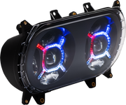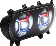 The Double-X LED headlight assembly from Custom Dynamics is a direct plug-and-play replacement for the Harley Road Glide. Double lamps within a completely sealed IP67 waterproof housing provide projection style low beam. Eight more LEDs utilize a reflective technology to produce a brilliant 1645 lumens high beam pattern. Double-X pattern color changing lights connect to a ProGLOW controller (sold separately) to utilize the most advanced LED color changing technology! Headlight is designed with unique fully accessible adjuster to allow for proper aiming of the headlight after installation. Clear polycarbonate lens is assembled with either a chrome or black reflector. Industry leading technology is utilized for BCM compliance to prevent interference and codes.