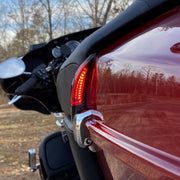 Set your bike apart with the CUSTOM DYNAMICS Sequential Tour Pak Seat Back Rest LED Lights in Black/Smoke for CVO models. Each unit boasts 12 dual intensity red LEDs behind a striking red or smoked lens, perfect for added running lights, brake lights, and attention-grabbing sequential red turn signals. These lights come pre-taped for easy attachment to the side of your Harley-Davidson King & Ultra style Tour Pak, and a plug and play wire harness is included. Don't miss out on this must-have addition for your bike!