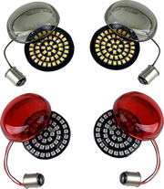 Rev up your ride with this Turn Signal Kit - LED - Front/Rear. Complete with front and rear Genesis? 4 LED turn signal replacements and required motorcycle turn signal lenses, this kit takes the adventure to the next level. With 48 super bright LEDs on a black circuit board, get ready for the brightest halo-free running light and turn signal. The front turn signals offer a bright white 6000K running light and a full contrast amber turn signal, while the Genesis? 4 Rear Motorcycle LED Turn Signals provide dual intensity red, with a red running light and full-intensity red brake. Get smoke front lenses and red rear lenses, all DOT and SAE compliant, and with a plug and play 1157 bulb base, installation is a breeze. Time to turn heads with this bold, risk-taking upgrade!
