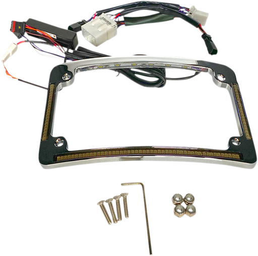 The CUSTOM DYNAMICS Tri-Radius License Plate Frame in chrome comes equipped with 20 powerful flushmount turn signal LEDs on each side that can be e...