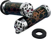 Unleash your wild side with the DRAG SPECIALTIES Chrome Skull Grips! Featuring a foam cushion hidden beneath the supple Black / Brown leather covers, these grips will give you the ultimate grip on the road. Let your daring spirit shine with the bold design of the red-eyed skull, adding an edgy touch to your ride. Don't just take the risk - conquer it! Throttle sleeve is not included.