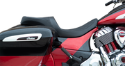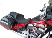 Fuel your adventurous spirit with the DRAG SPECIALTIES Low Profile Extended Reach Solo Double Diamond Black Stitch Vinyl Seat - Black - Indian '14-'22. Designed for maximum comfort and style, this seat features molded polyurethane foam and a 3/16" ABS thermoformed seat base. The fully carpeted bottom with rubber bumpers ensures protection for your paint. With a 5-1/2" driver support and a seat geometry that places the rider 2" further back and 1/2" lower than the stock seat, this seat is perfect for those who like to take risks. Plus, the narrow front design provides better leg clearance for ground contact. Includes all necessary mounting hardware and proudly made in the U.S.A. Dare to stand out and upgrade to this seat today!