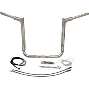 1-1/2" EZ Install Pointed Top Handlebar Kit - 16" in Chrome. Featuring an adjustable 1-1/2" collar next to the controls for a personalized look, this bolt-together two-piece design saves shelf space, ships easily, and installs faster than ever. Crafted from CNC mandrel-bent heavy-walled tubing, it eliminates the hassle of internal wiring with a billet-machined top that allows quick wire routing. The kit includes everything to extend your clutch and brake lines, cutting installation time in half. Knurled and notched for TBW use, compatible with OEM heated grips, proudly made in the USA.