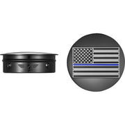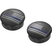 Make a statement with these custom black Swing Arm Covers featuring a reversed Blue Line American Flag design. Crafted from durable 316L stainless steel, they protect your bike from contaminants and secure firmly with four spring-loaded ball bearings and an O-ring seal. Easy to install, they fit all Harley-Davidson Touring models, including Trikes. On some bikes, the right side may require a gentle push due to paint overspray. Boldly enhance your ride with these distinctive covers.