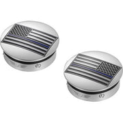 Show your pride with these custom Swing Arm Covers featuring a reversed Blue Line American Flag design. Made from rugged 316L stainless steel, they block out contaminants and stay firmly in place thanks to four spring-loaded ball bearings and an O-ring seal. Installation is quick and fits all Harley-Davidson Touring models, including Trikes. On some bikes, the right side may need a slight push due to paint overspray. Make a bold statement while protecting your ride with these striking covers.