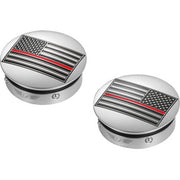 Swing Arm Covers showcasing the Red Line American Flag in a custom reversed design. Made from robust 316L stainless steel, these covers protect against contaminants. They stay firmly in place with four spring-loaded ball bearings and a tight O-ring seal. Installation is simple and compatible with all Harley-Davidson Touring models, including Trikes. Be aware that on some bikes, the right side may need a slight push due to paint overspray. Make a bold statement with this striking upgrade.