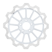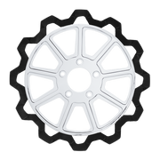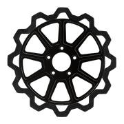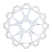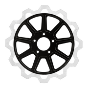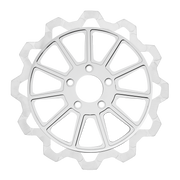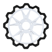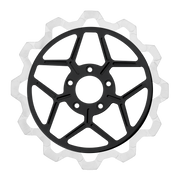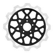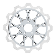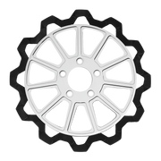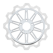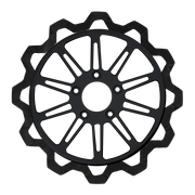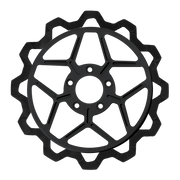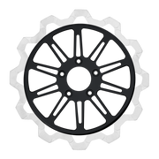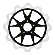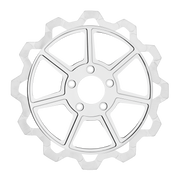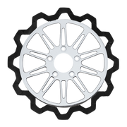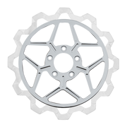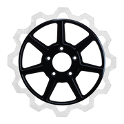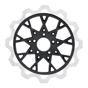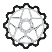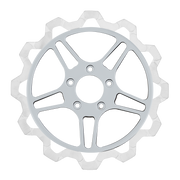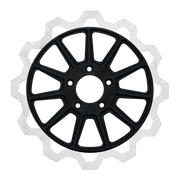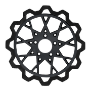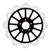 The reduced weight of Lyndall Crown cut rotors enhances rider control by minimizing rotating mass, while the incorporated gas slots effectively outgas debris and gasses generated during friction, preserving the rotor's integrity against brake pad wear and aiding in cooling.