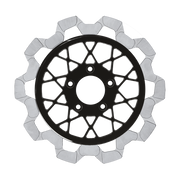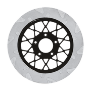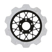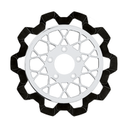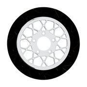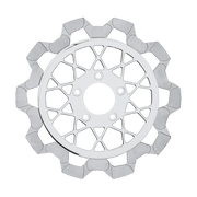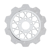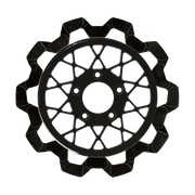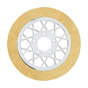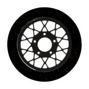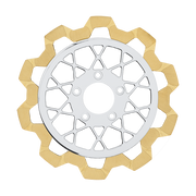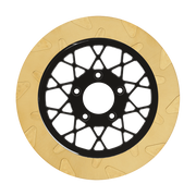 The reduced weight of Lyndall Crown cut rotors enhances rider control by minimizing rotating mass, while the incorporated gas slots effectively outgas debris and gasses generated during friction, preserving the rotor's integrity against brake pad wear and aiding in cooling.