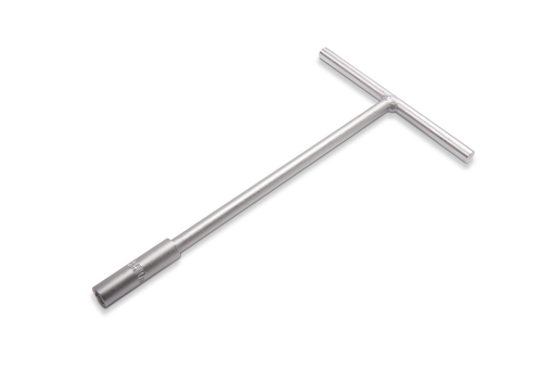 The 12 mm T-handle wrench is designed with a hex socket that only extends partially inside, securely holding the nut in place. Its narrow outer dia...