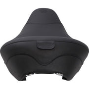 Take on the open road with the Vintage Wide Solo Seat With Drivers Backrest - Smooth - Black - Touring '08-'21. This solo seat sports a sleek skirt that expertly covers the frame and fender, creating a seamless look. The backrest boasts four adjustment levels (ranging from 13.5" to 15.5" above the seat) and can be easily removed and installed without any tools. With a sturdy steel base and support wings, this seat is ready to handle whatever adventure comes your way. Made in the U.S.A.