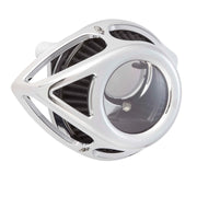 The Clear Tear Air Cleaner Kit in Chrome pushes the classic teardrop shape into a bold new realm. Its O-ringed breather fits tight at the heads, channeling airflow through custom shooter tubes right into the throttle body's mouth. Riders can flip the radius window front or back for their signature style. An integrated oil-catch blocks oil from fouling the filter or choking airflow. Crafted with a tough polycarbonate top and a black pre-oiled, washable cotton filter, this CNC-machined cage screams precision and performance with stealthy breather backing plate tech.