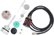 Billet dipsticks vent/breathe excessive crank case pressure from the oil tank through a PCV style breather, consisting of an oil separator system, perforated disc, replaceable filter element and umbrella flapper valve, Screws into the factory oil fill spout as a stock replacement part, Blowby is pressure that is forced past the rings and cylinders, pushed into the crankcase and then forced into the oil tank, Fueling test results show a decrease in engine oil sump levels, more freely/smoothe revving engine and increased MPG and decreased blowby, Removes unwanted build-up of blow by pressure in the oil tank, There are two ways to read the oil level with this dipstick, with the bike on the jiffy stand (FHS) Full Hot Stand or the bike upright and level (FHU) Full Hot Upright, Includes 2 different venting style options for installing the dipstick: option 1 - 1/8 NPT breather vent fitting with internal porous filter element, option 2 - quick disconnect coupler fitting with rubber hose and filter element, It is important to get the correct hot oil level in your bike. Feuling recommends running the oil level 90%-99% full when hot, The oil pick up port is on the right side of the engine. Letting the bike idle or warm up on the kickstand will naturally fill the engine case and skew the oil level in the tank, Made in the USA, This dipstick does get hot, use a glove when checking oil level.