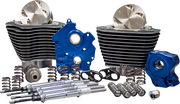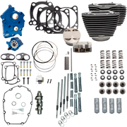 Made in the U.S.A., Big Bore Kit, 107" to 124" Big bore kit, Bolt on kit., No case machining required, Forged pistons, 11.1 Compression ratio, Oil Pump/Cam Plate, Precision machined from billet aluminum, Blue anodized finish, Passage plugs removable for servicing, Independent scavenge sections for flywheel cavity and cam chest, Debris screens in both scavenge pickups, Magnet in cam chest to help to stop debris from entering oil pump, Increased flow capacity on both feed and scavenge side, Adjustable pressure relief valve is adjustable with unit installed in engine, Pushrods, Quickee pushrods, Tappets:, S&S precision tappets, Tappet Cuffs, Hard anodized black coating, Billet aluminum construction, Stronger than stock material eliminates distortion
