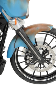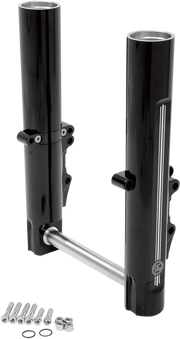 Artfully sculpted from heat-treated billet aluminum, Machined PM icon logo with a pin-stripe detail that extends the length of the fork legs, and a hidden-axle design, Kits include axle, axle covers, left and right legs with caliper and fender mounts installed, Made in the U.S.A.