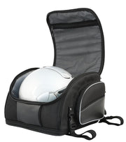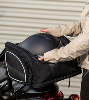 - Universal attachment on rack, sissy bar or back seat with quick release and self-fastening straps