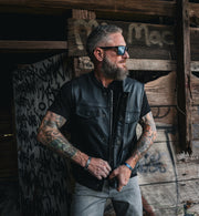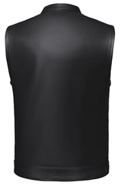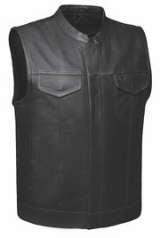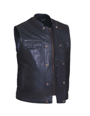 The Men's Ultra SOA Style Club Vest by Unik Ultra blends iconic design with practical features. Made from cowhide leather, it includes four exterior pockets, two inside concealed carry pockets, a zip snap main closure, antique brass hardware, and a one-panel back, offering versatility and functionality for various settings.