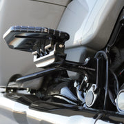 Passenger Forged Floorboard Mounts in sleek all-black for Touring models from '99 to '25. Crafted from forged aluminum and precisely CNC machined, these mounts come complete with mounting bolts, hinge pins, and spring stops for straightforward installation. They fit nearly all OEM-style passenger floorboards, both factory and aftermarket. Featuring a bold spring-loaded pin design, they make mounting effortless while minimizing the risk of losing tiny ball and spring stops common in factory mounts. Upgrade your ride with confidence and style.