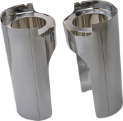 Take on any terrain with the ARLEN NESS Fat Tire Fork Boot Cover in chrome. These smooth boots are specifically designed to fit on '14-'24 FLH/FLT front ends, allowing for the use of fat or wide front wheels. With their factory-like styling and compatibility with Arlen Ness fat front fender designs, you can easily install 18" x 5.5" or 21" x 5.5" fat custom front wheels without any extra work. Constructed from high-quality steel, these boots are strong and durable for any adventure. Perfect for those who crave risk and excitement, these boots are a true bolt-on solution for any wide or fat tire front ends. Upgrade your fork legs and triple trees with these versatile and stylish boots.