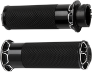 Take your biking experience to the next level with these ARLEN NESS Beveled Grips in a sleek black color. These grips provide unbeatable traction for your hands and are accented with intricately machined billet aluminum. Each grip comes with a throttle sleeve already installed, and we even provide grip glue and straightforward instructions so you can easily install them yourself. For even more style, check out our matching footpegs and shifter pegs, sold separately. Ride on with confidence and boldness!