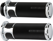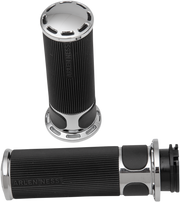 Boldly face every race with ARLEN NESS Slot Track Grips - Cable - Chrome! These grips offer superior traction for your hands, with intricately machined billet aluminum accents in perfect chrome or anodized black finish. The Slot Track design includes 1-1/4" inner collars, air cushion rubber thumb pads, and linear knurled rubber grips with slotted billet aluminum end caps. To make installation a breeze, all grips come with a pre-installed throttle sleeve and grip glue, as well as easy-to-follow instructions. Match your grip game with separately available footpegs and shifter pegs. Take your ride to the next level with ARLEN NESS!