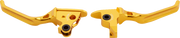 The ARLEN NESS Lever Set - Method - Gold contains high-performance forged hand levers with an ergonomic shape and short length. Each lever has been designed for improved control and comfort, with the backside cut out for a lighter weight. Crafted from CNC machined forged billet aluminum, these levers are polished to perfection and feature laser-engraved Arlen Ness logos. Comes with both throttle and clutch side levers.