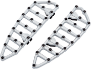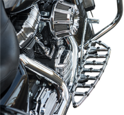 The ARLEN NESS MX Billet Driver Floorboards in Chrome offer a bold, risk-taking design with integrated rubber inserts for optimal foot traction. Constructed from a solid block of billet aluminum, these floorboards are CNC machined for durability. The rubber inserts not only provide traction but also protect the finish of the floorboards. These extended length floorboards offer added foot room and comfort, perfect for adventurous riders. Note: Models with passenger footpegs will need to use OEM accessory floorboard mounts.