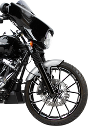 Experience the thrill of the open road with the ARLEN NESS Pro Short 21" Front Fender for Touring '86-'13. This short fender is crafted from a single piece of 14-gauge steel, providing maximum durability and minimizing the need for bodywork. The black anodized billet bracket makes installation a breeze and allows for ample space for oversized 14" brake rotors. Made in the USA, this fender is sure to add a touch of performance to your touring bike. Accepts 120/70-21 tire.