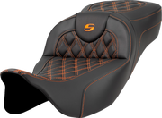 Ramp up your riding experience with the SADDLEMEN Extended Reach Roadsofa* Seat - featuring a dynamic lattice stitch in bold orange and no backrest for a daring and exhilarating ride! This seat takes a risk, separating the seating surface from the lumbar support to reduce pressure and increase long-range comfort. With a combination of progressive density foam and SaddleGel inserts, it ensures superior comfort for both driver and passenger. The pillowed soft upholstery cover, backed by a compliant foam layer, offers unmatched comfort and style. Designed to move the driver 2* further back from the stock position, this seat also boasts a tall lumbar support and wide saddle for ultimate comfort and support. Plus, the streamlined nose not only adds style but improves the rider's reach to the ground. Get ready for thrilling adventures on the road with this classic button-tufted seat, proudly made in the USA.