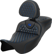 Discover the RoadSofa Seat with Honeycomb Blue Stitch and Backrest for Extended Reach in 2008-2023 TOURING models. Combining a Gel-Core* interior and Pro-Foam*, our seat offers the perfect balance of compression and resilience for unbeatable long distance comfort. Plus, our Pro-Foam* unique molding process creates an element-resistant, self-skinning foam that's sealed from water, adding durability and comfort to your ride. The stylish Honeycomb (HC) pattern and SaddleGel* technology in the front and rear provide enhanced comfort for both driver and passenger. Get ready for the ultimate adventure with this USA-made seat!