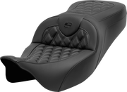 Embrace the thrill of the ride with the Roadsofa Seat, featuring a lattice stitch design and carbon fiber construction. With SaddleGel* for reduced pressure and increased comfort, this seat is perfect for daring drivers and passengers alike. The tall lumbar support and wide driver saddle provide superior comfort, while the refined split-cushion design separates the seating surface for ultimate long-distance comfort. Made with ventilated soft upholstery leather, this seat offers a luxurious look and ride, and is proudly designed and made in the USA. Take on any adventure with the 5-1/2" (13.97 cm) lumbar support and a streamlined nose for improved reach to the ground. Rain or shine, this seat is ready for whatever risks you're willing to take! (No rain cover included; optional add-on available.)