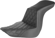 The Step-Up Seat with Front Lattice Stitch in black for Softail '18-'24 features Ultra-Foam’s innovative molding that seals out water and boosts durability and comfort. Designed to keep rider and passenger secure, it perfectly balances firmness and flexibility with a GelCore* interior. Installation is straightforward with all hardware and instructions included. Its high lumbar support locks you in, while the whisper-grain SaddleHyde* cover adds style. Proudly crafted in the USA, this seat commands control and confidence on every ride.