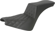 The SADDLEMEN Step-Up Seat with Front Lattice Stitch in black for Softail '18-'24 models offers exceptional durability and comfort through Ultra-Foam’s water-resistant, self-skinning molding process. Its GelCore interior combined with Ultra-Foam provides the ideal balance of firmness and flexibility, keeping the rider securely in control. Designed to enhance comfort for both rider and passenger, it features high lumbar support and a whisper-grain SaddleHyde cover. Installation is quick and easy with all necessary hardware and instructions included. Proudly made in the USA for riders who demand bold style and lasting performance.
