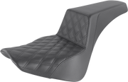 The Step-Up Seat with Front Lattice Stitch in Black for Softail '18-'24 features Ultra-Foam’s cutting-edge molding that forms a water-resistant, self-sealing foam, boosting both durability and comfort. It skillfully combines rider and passenger comfort with ergonomic design to keep the rider securely locked in control. The blend of GelCore* and Ultra-Foam provides the perfect balance of firmness and flexibility. High lumbar support ensures the rider stays firmly in place, while the whisper-grain SaddleHyde* cover delivers sleek, weatherproof style. Installation is hassle-free with all hardware and instructions included. Made in the USA for riders who demand bold performance.