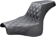 The Step-Up Seat - Front Lattice Stitch in Black for Softail '18-'19 features Ultra-Foam molded with a water-resistant, self-sealing design that protects the foam and boosts durability and comfort. It expertly combines rider and passenger comfort with ergonomic support to keep you firmly in control. The GelCore* interior paired with Ultra-Foam strikes the ideal balance between firmness and flexibility. Installation is simple with all hardware and instructions included. High lumbar support locks you in place, while the whisper-grain SaddleHyde* cover adds rugged style. Made in the USA for riders who demand confidence and control.