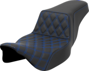 Go for the ultimate ride with the SADDLEMEN Step-Up Seat in Front Lattice Stitch and bold Blue Stitch for extended reach on your FLH/FLT '08-'23 touring bike! This seat doesn't shy away from risks, featuring a Gel-Core interior and Ultra-Foam for the perfect blend of strength and comfort. The unique Ultra-Foam molding process creates a rugged and water-resistant seal that enhances durability. Channel your inner adventurer with the vintage-inspired LS stitch and enjoy a seat that's proudly designed and crafted in the USA. Take on the road with confidence and style - this seat will have you craving more thrilling rides!
