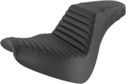 The Step-Up Seat in black, featuring Front Tuck-n-Roll and Rear Lattice Stitch, is designed for Softail models from ’18 to ’20. Utilizing Ultra-Foam’s advanced molding, it creates a water-resistant, self-sealing foam that boosts both durability and comfort. The combination of GelCore* and Ultra-Foam offers the perfect balance of firmness and flexibility, keeping the rider securely in control. High lumbar support locks you into place, while the whisper-grain SaddleHyde* cover adds grip and style. Installation is simple with all hardware and instructions included. Made in the USA for riders who demand uncompromising performance.