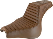 The Step-Up Seat in brown, featuring Front Tuck-n-Roll and Rear Lattice Stitch, is designed for Softail models from ’18 to ’23. Its Ultra-Foam construction uses a specialized molding process that seals the foam against water, enhancing durability and comfort. The combination of GelCore* and Ultra-Foam provides the ideal balance of firmness and flexibility, keeping both rider and passenger secure and in control. High lumbar support locks you firmly in place, while the whisper-grain SaddleHyde* cover adds grip and style. Installation is simple with all hardware and instructions included. Made in the USA for riders who demand bold performance.