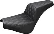 The Step-Up Seat - Full Lattice Stitch in Black for Softail '18-'24 features Ultra-Foam crafted with a water-resistant, self-sealing process that protects the foam and boosts both durability and comfort. It expertly combines rider and passenger comfort with ergonomic design to keep you firmly locked in and in control. The GelCore* interior paired with Ultra-Foam delivers the perfect balance of firmness and flexibility. Installation is simple with all hardware and instructions included. High lumbar support secures your position, while the whisper-grain SaddleHyde* cover adds a sleek, tough finish. Made in the USA for riders who demand confidence and control.